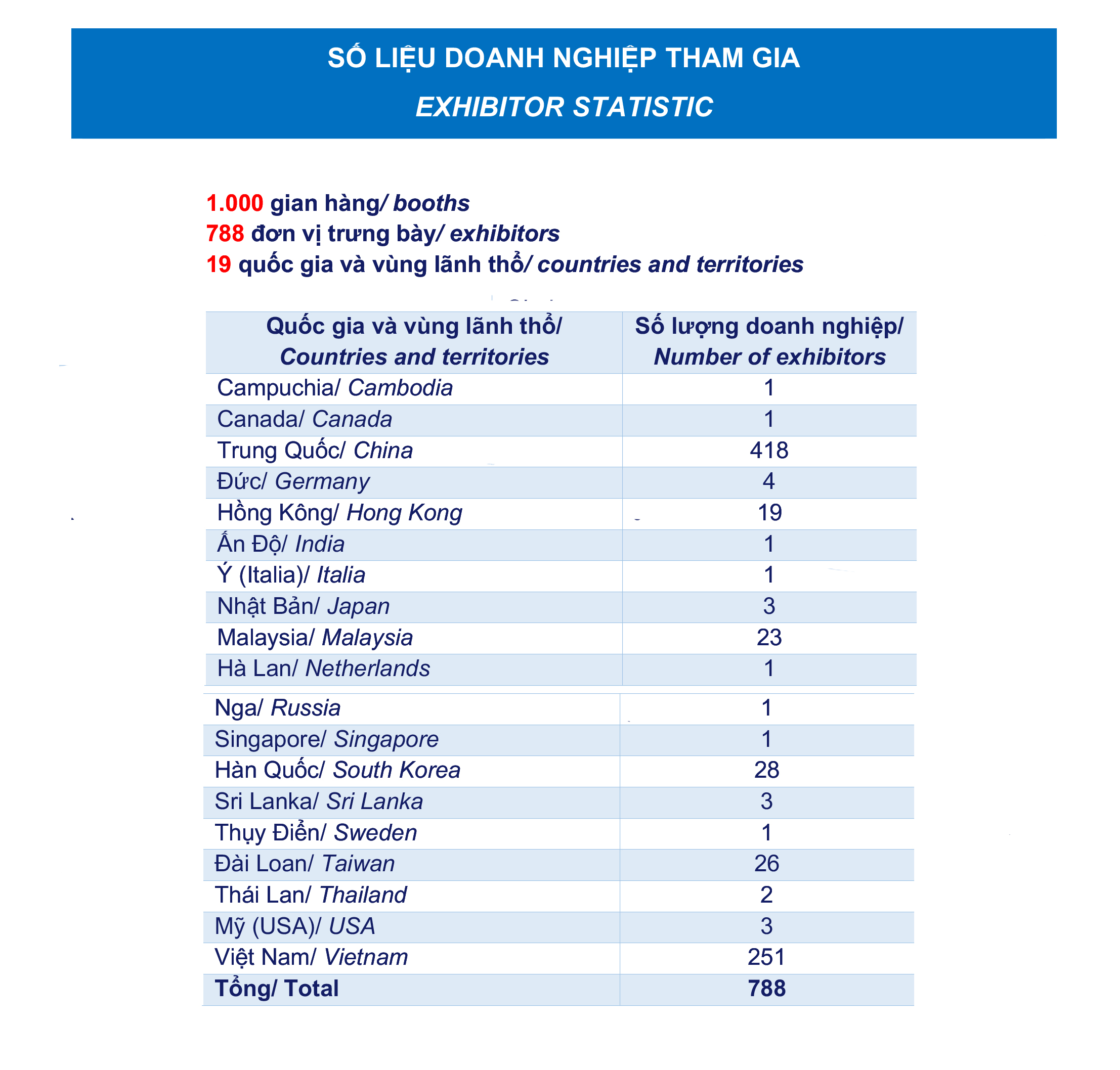 2025第23届越南胡志明国际贸易博览会(胡志明冬季展)总展览规模1000个展位788家参展企业、19个国家和地区组团参展,包括越南、中国、意大利、德国、日本、荷兰、俄罗斯、加拿大、美国、斯里兰卡、瑞典、柬埔寨、老挝、缅甸、印度、马来西亚、泰国、新加坡及台湾地区,其中中国展团最大(418家参展企业),展会期间共吸引了观众2万多人次来访观摩和采购。
