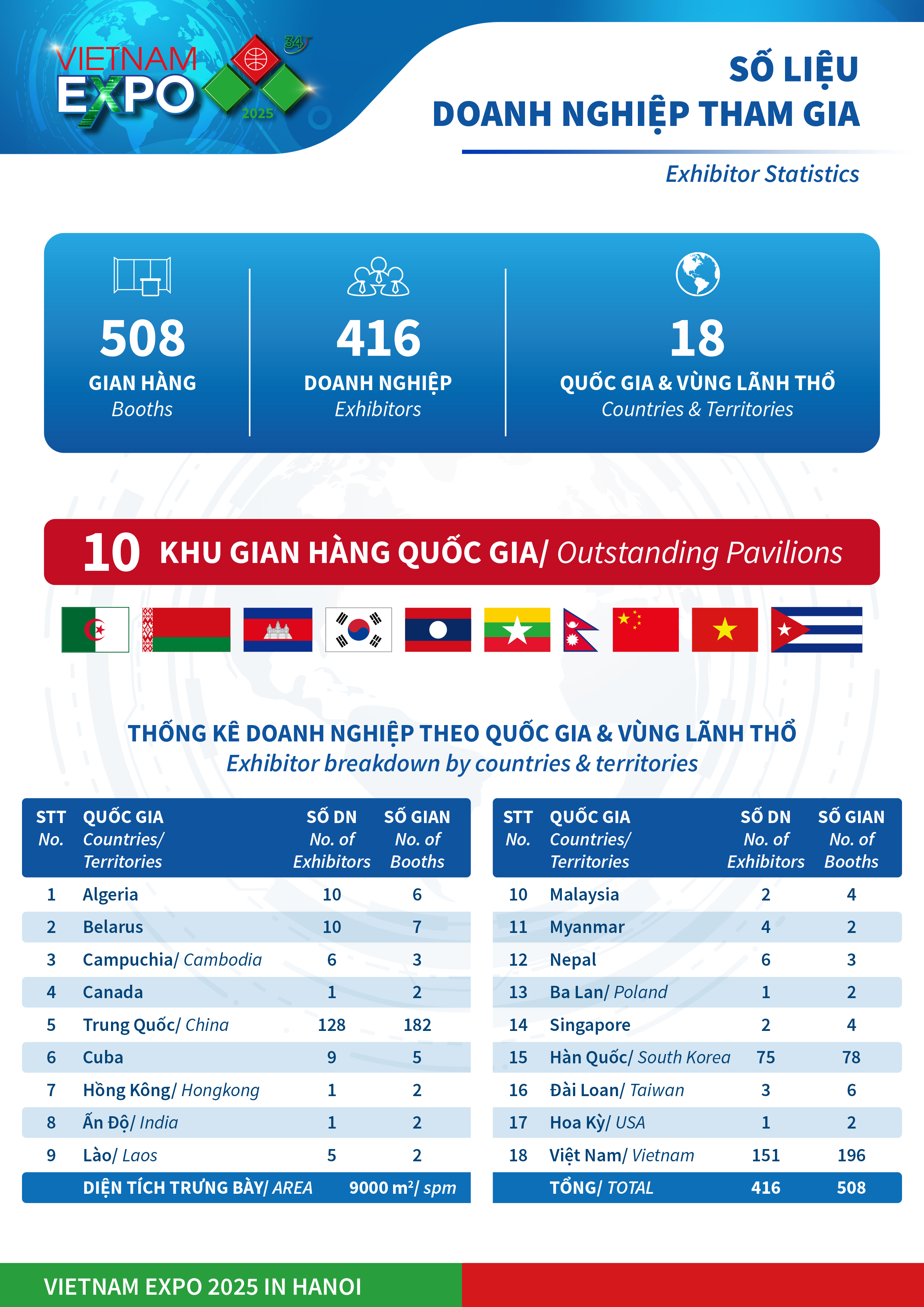 2025年第34届越南贸博会(河内夏季展)总展览规模550个展位480家参展企业、16个国家和地区组团参展,包括越南、中国、波兰、韩国、日本、俄罗斯、古巴、柬埔寨、老挝、缅甸、印尼、马来西亚、新加坡、尼泊尔及香港和台湾地区,其中中国展团最大(88个展位),全展期共吸引了观众超2万人次来访观摩和采购。