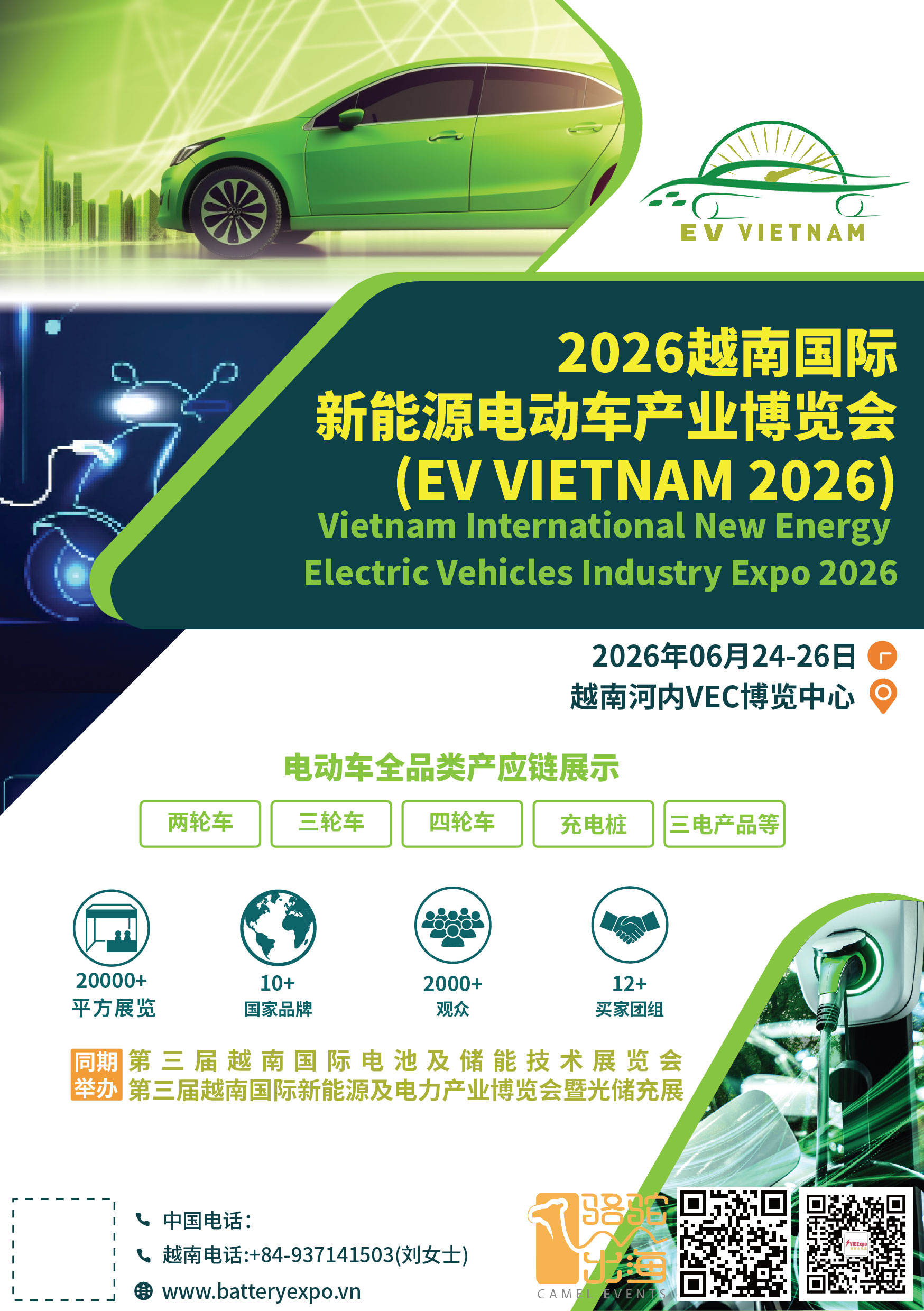 2026年6月24日至26日,越南国际新能源电动车产业博览会(EV VIETNAM 2026)将于越南河内VEC博览中心举行。博览会将与2026第三届越南国际电池及储能技术展览会Battery Expo 2026同期举行,涵盖新能源电动车及充电桩技术的全产业链,展示行业的最新技术和产品,促进技术创新和应用,为参展企业提供展示创新成果的交流与交易机会,并通过搭建参展商和越南业界买家商家的对接服务,促进产品和技术的销售与合作,为越南新能源电动车产业对外开放与合作提供一个高专业性、高融合度、高效率的展示交流平台。