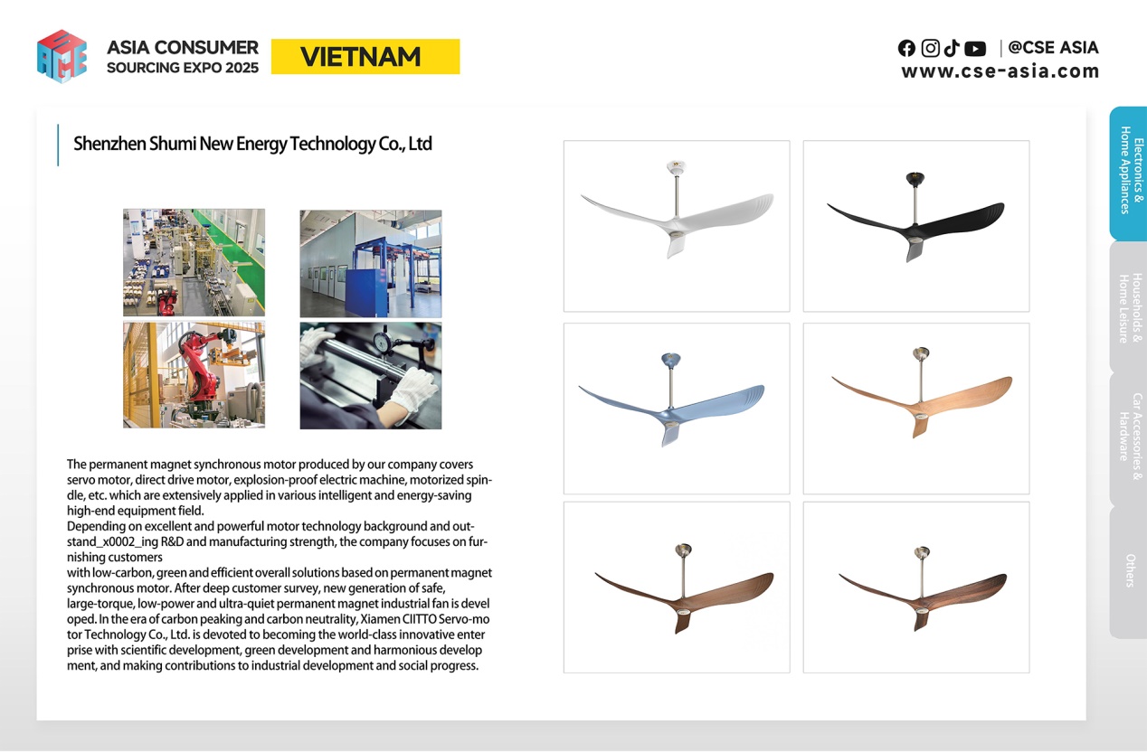 在“智能家电与新能源专区”,Ningbo Chuangxing Intelligent Technology Co., Ltd. 展示了其研发的车载吸尘器与电动气泵,兼具高效能与便携性;Shenzhen Shumi New Energy Technology Co., Ltd. 则推出了节能型永磁同步电机,广泛应用于工业风扇与智能设备中,体现中国制造在节能环保方面的技术积累。