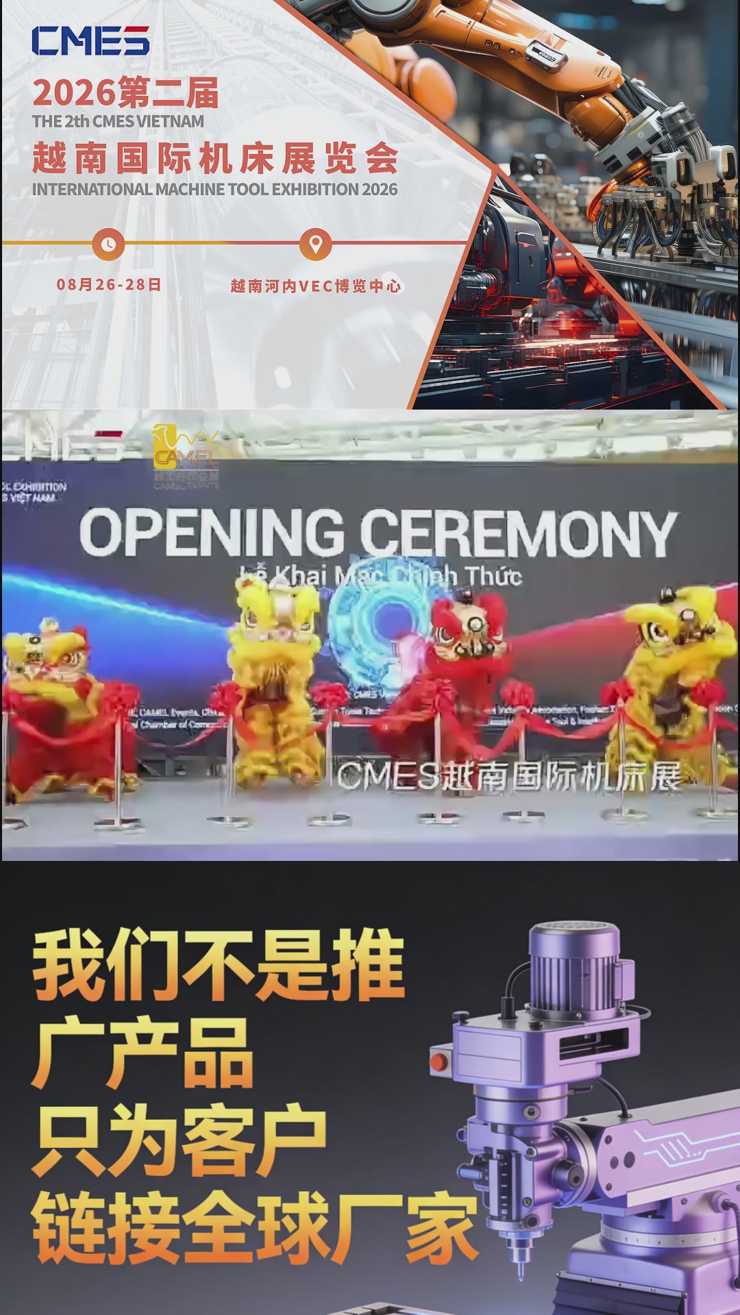 在全球制造业加速向数字化、智能化深度转型的浪潮中,越南凭借其强劲的增长动能正成为区域制造业的新焦点。2026年第二届CMES越南国际机床展将作为构建制造业新基座的核心平台,系统回应市场对高精度、自动化、智能化机床设备及解决方案的海量需求,致力于提升精密加工能力、实现生产流程数字化与降低制造能耗。依托首届成功经验,本届展会将全面升级,以30,000平米的展览规模打造“2026越南超级工业周”,汇集全球顶尖品牌,精准聚焦越南本土化应用需求。