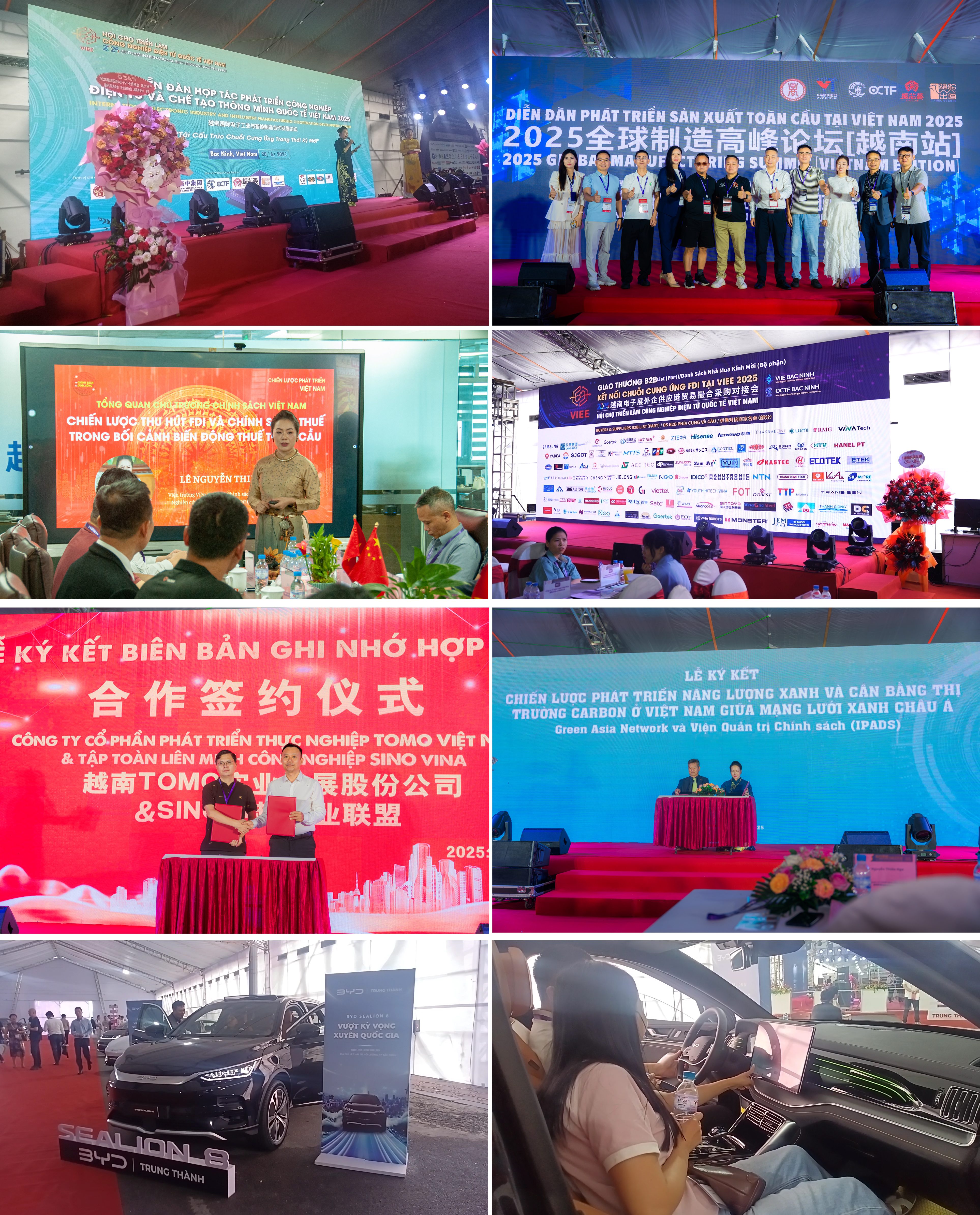 展会同期举办越南国际电子工业与智能制造合作发展论坛、2025全球制造高峰论坛(越南站)、越南政商界与外企CEO交流会、越南三星及外资工厂供应链贸易撮合对接会、现场B2B 贸易分场对接会、三星集团入围供应商初选面洽会、比亚迪智驾体验活动、探园探厂考察活动(北宁嘉平II工业园、桂武台中越工业园)....等丰富多彩的贸促活动,并举行了多场签约仪式。