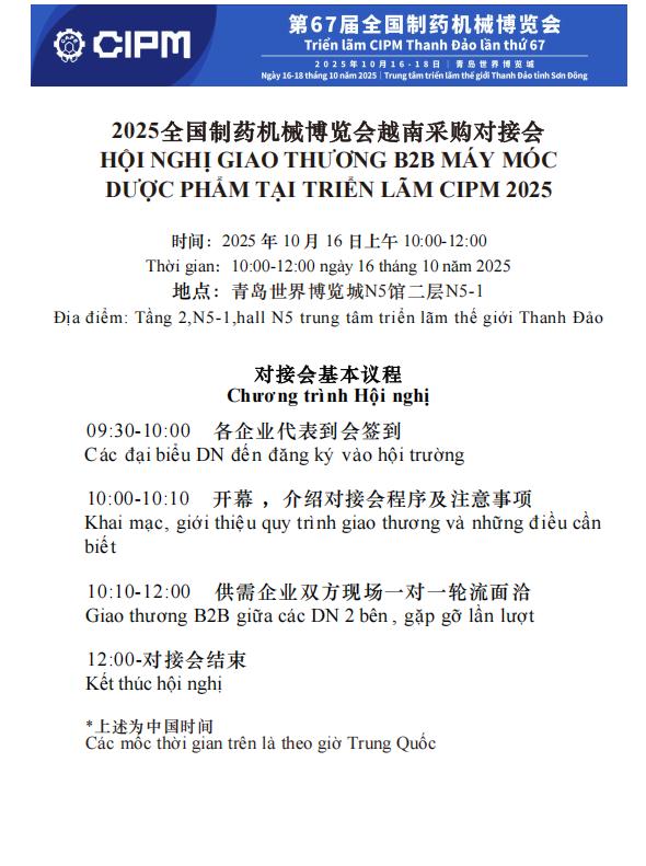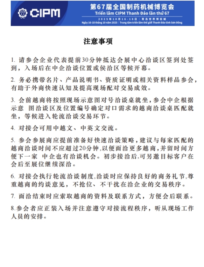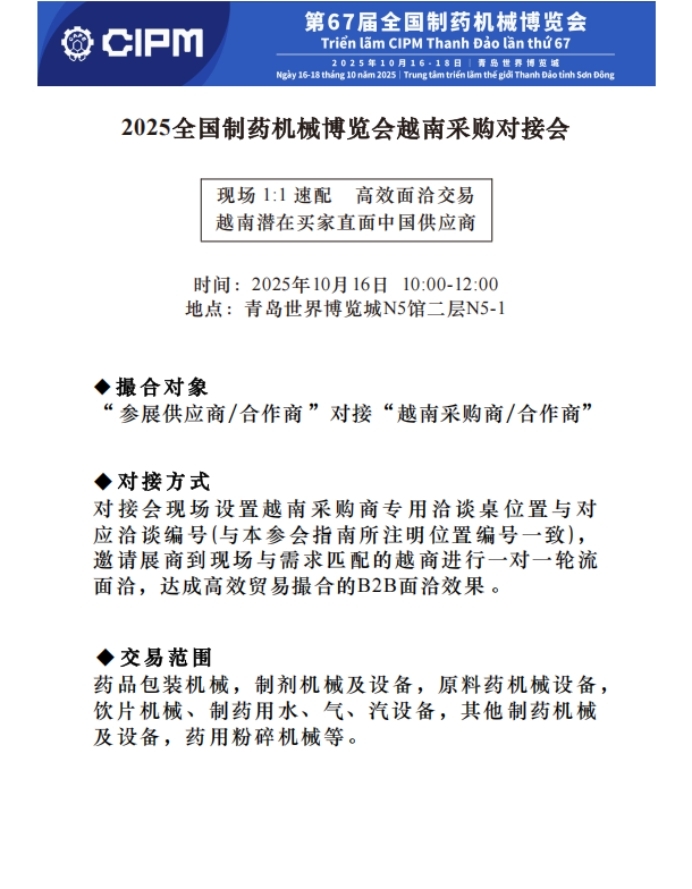 由中国制药装备行业协会主办、海南精博信展览有限公司承办的第67届(2025年秋季)全国制药机械博览会暨2025(秋季)中国国际制药机械博览会(以下简称“药机博览会”)将于2025年10月16日-18日在青岛世界博览城举办。为助力中国制药设备企业精准开拓越南市场,越中会展&骆驼出海特邀越南制药行业相关企业到会,并出席参加“国际采购对接会”,为展商搭建与越南实力买家高效洽谈的直通桥梁。