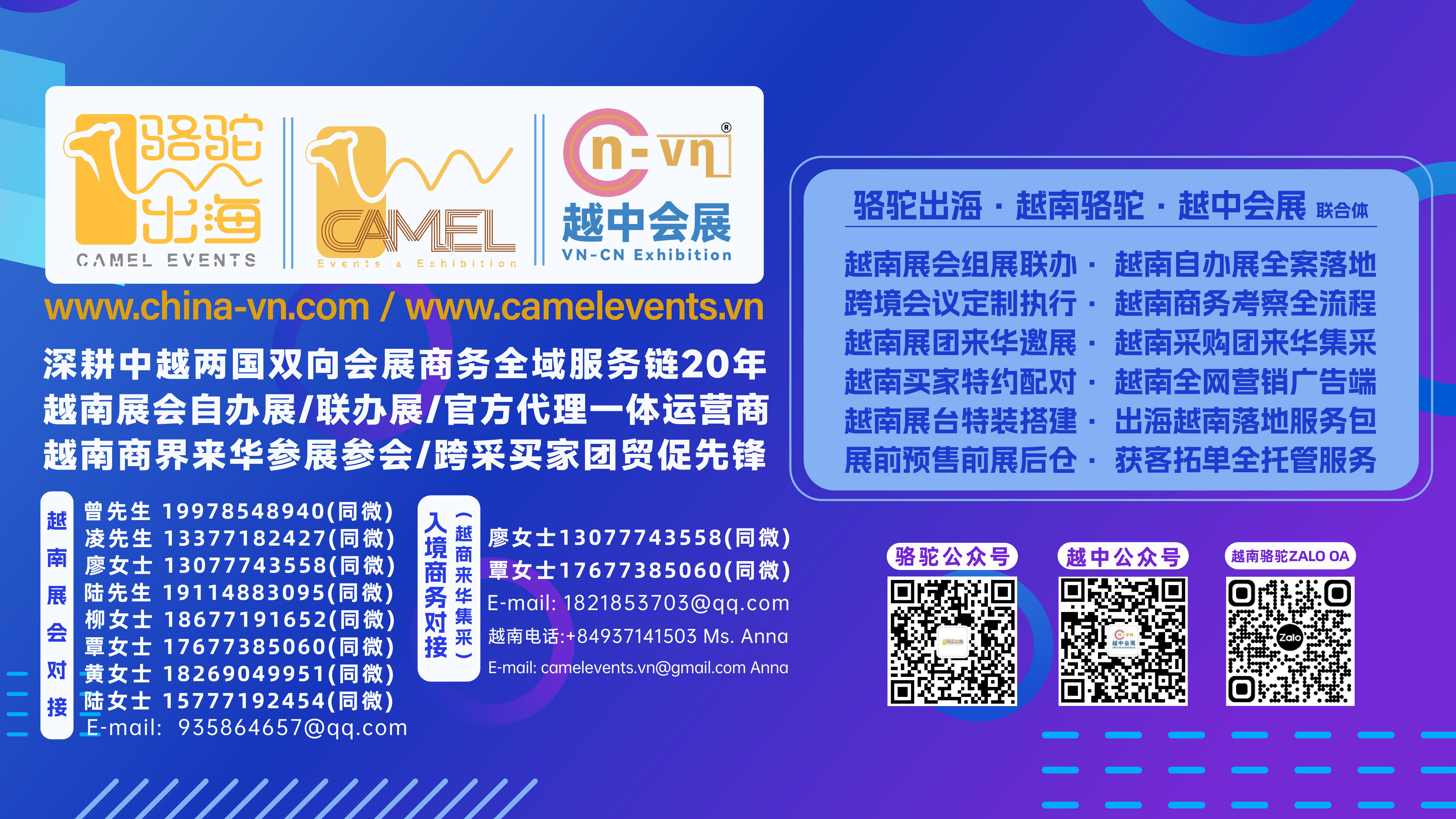 这不仅是一场展会,更是您直通越南新兴市场的“快车道”。作为本次对接会的联合组织方,越中会展&骆驼出海将依托在越南市场深厚资源与会展组织经验,以及在跨境商务对接与企业出海服务方面的专业能力,为中国展商与越南采购商提供高效、可靠的贸易桥梁。