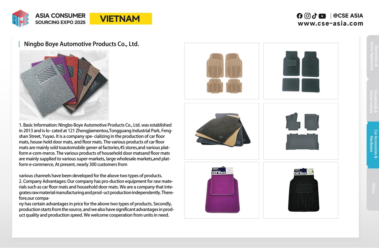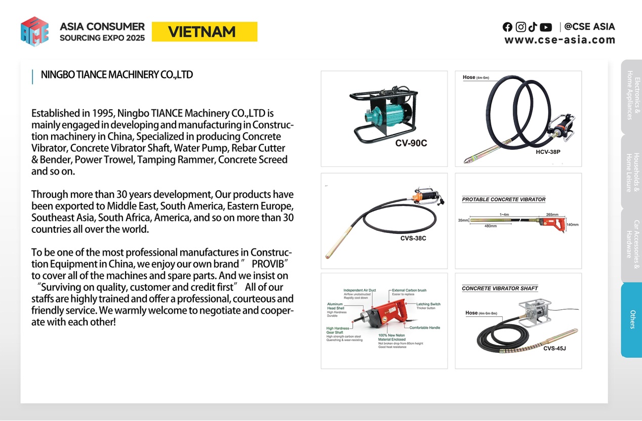 此外,在汽摩配件方面,Ningbo Boye Automotive Products Co., Ltd. 作为专业车垫生产商,带来了专为汽车原厂、4S店及电商平台开发的高性价比汽车脚垫系列,展现了从原材料到成品的一体化制造优势。在五金工具方面,Ningbo Tiance Machinery Co., Ltd. 展出的“PROVIB”品牌建筑机械,如混凝土振动器、钢筋加工工具等,以其30年的专业制造经验,吸引了东南亚地区建筑行业买家的目光。