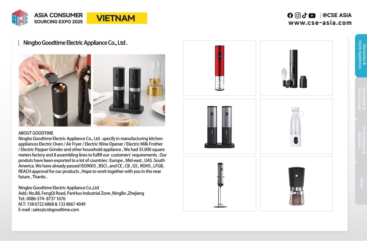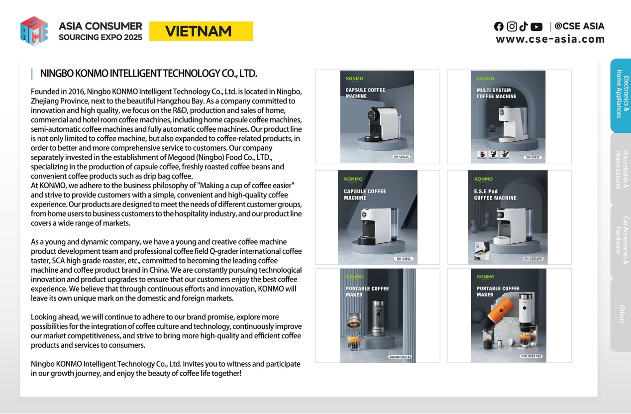 本次博览会CSE ASIA主题展特别设置了“智能家居与家电专区”、“五金工具与汽摩配专区”、“家居日用与礼品专区”等主题展区,集中展示中国制造的高品质、创新型消费品。例如,Ningbo KONMO Intelligent Technology Co., Ltd. 带来的智能咖啡机系列,支持全自动冲泡与胶囊兼容,满足家庭与商用需求;Ningbo Goodtime Electric Appliance Co., Ltd. 展示的空气炸锅、电烤箱等厨房小家电,以其高性价比和多样化功能吸引众多关注。